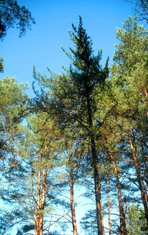 Bankso pušis (Pinus Banksiana) (centre) ir jos kankorėžiai:...