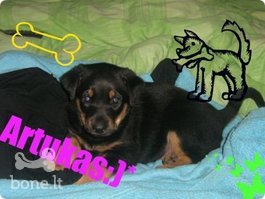 Mazeikiuose 2009-04-13 respublikos 10 dingo suo. Dar mazas. 1 menesio. vardas Artukas, bet saukiamas dar neatsiliepia. Maisytas vilksunis su spejama kad dobermanu. Jis visas juodas, bet rusvos leteneles, ir pakakle.