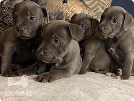 Nuostabūs Stafordšyro terjerų šuniukai, pasiruošę keliauti į naujus namus.